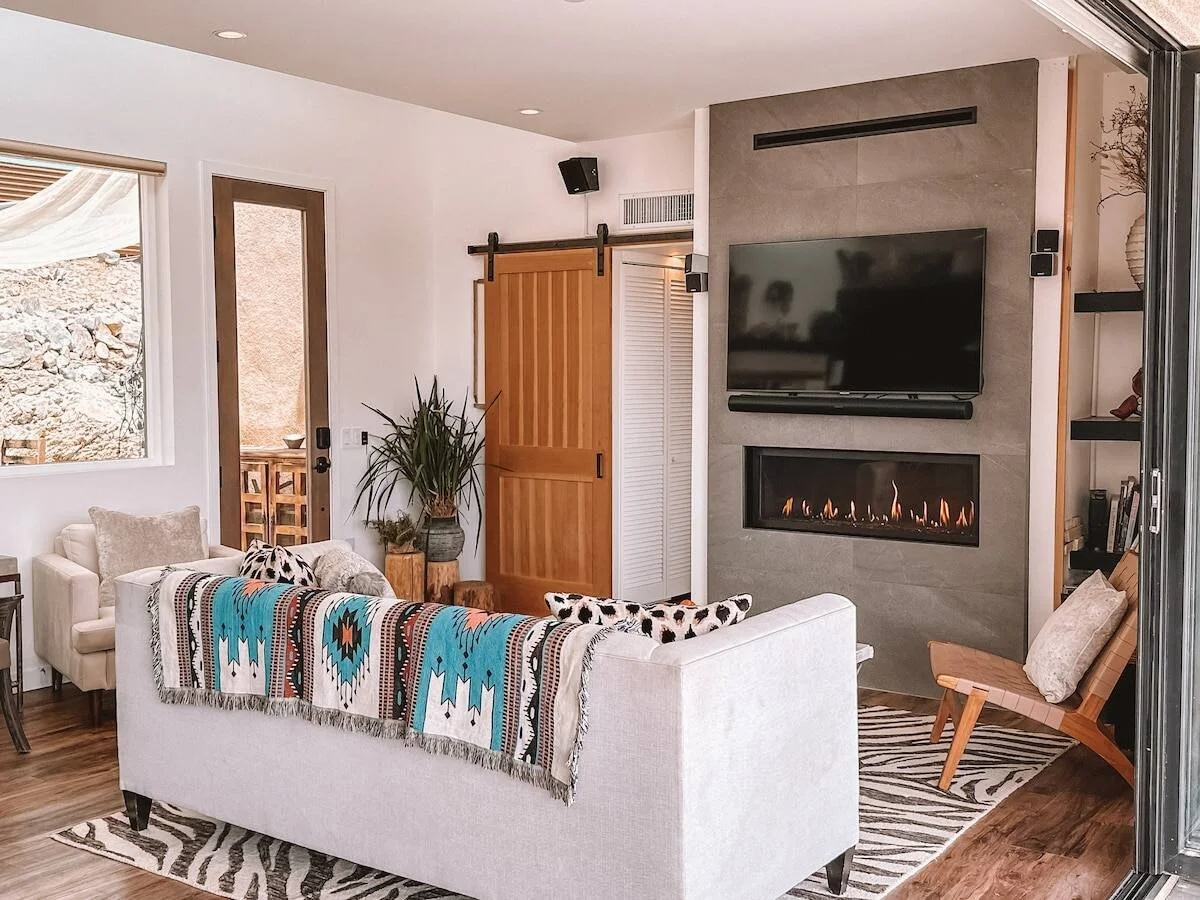 The living area is a perfect blend of comfort and elegance, with 16-foot accordion sliding glass doors that open up to the pool area, creating a seamless indoor-outdoor living experience. Cozy up by the gas fireplace and enjoy the serene ambiance. A large smart TV mounted over the fireplace and fresh popcorn from the popcorn machine makes for the perfect movie night. A large vinyl collection for the record player, surround sound music and Sonos Move portable speakers gives you a variety of ways to set the mood. The open-plan design connects the living room to the fully stocked kitchen, making it ideal for socializing and relaxation. If you're really feeling yourself, we have a karaoke setup that you just might have to pull out and showcase your entertainment skills.