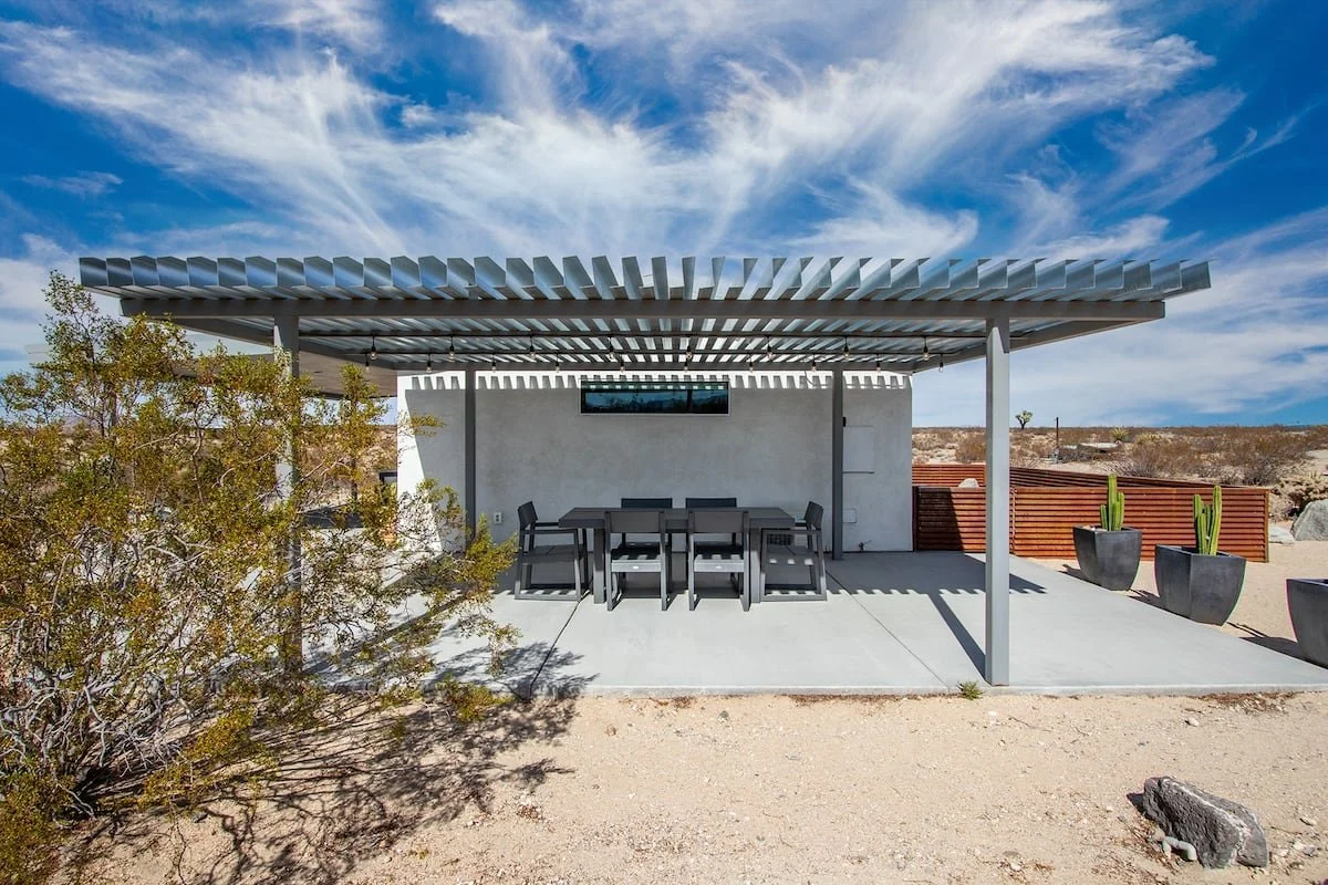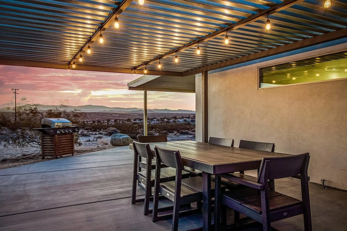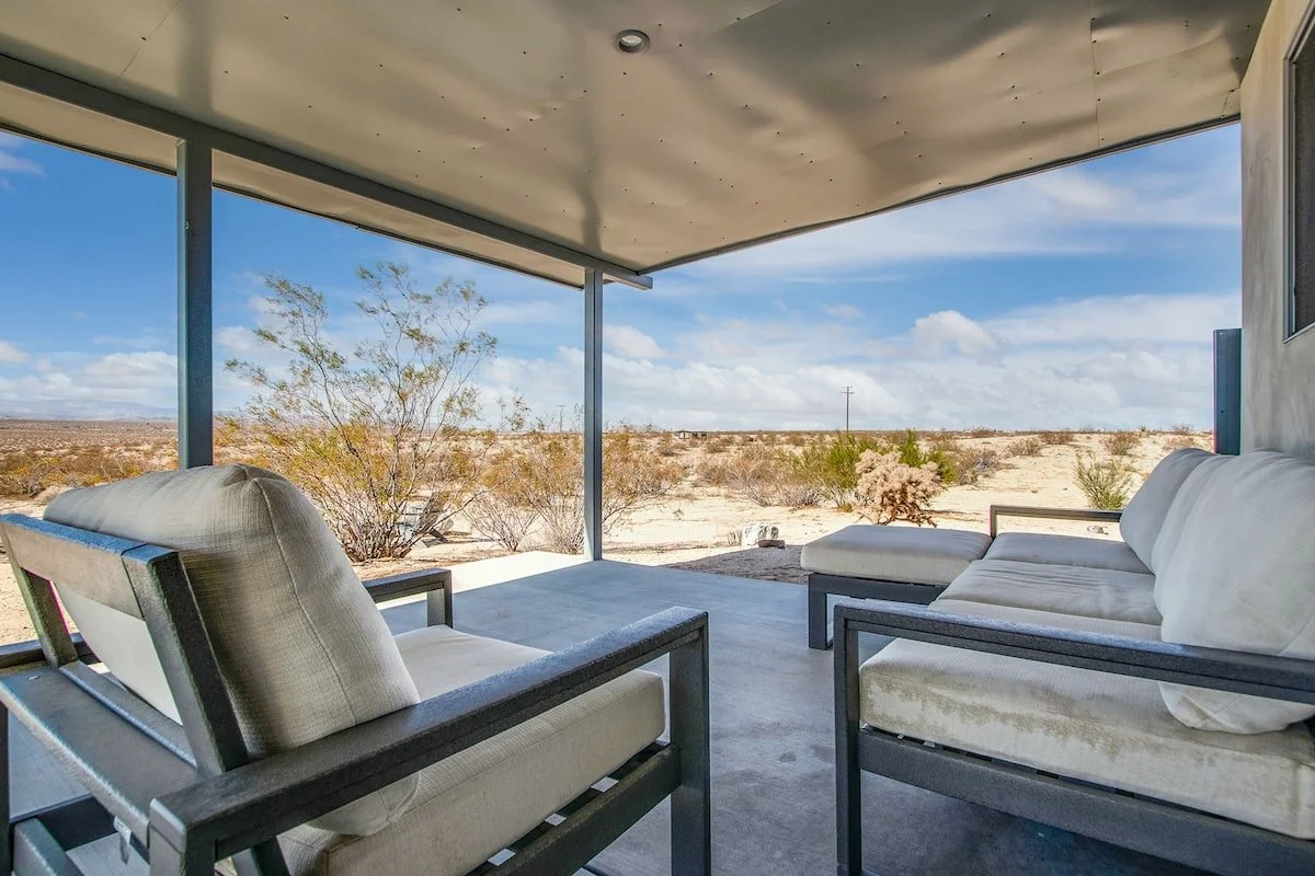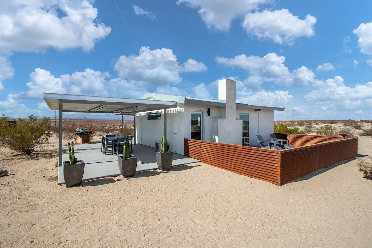 While the house is small on square footage, the property is expansive with many different outdoor possibilities--there's a covered side porch and outdoor dining table for enjoying meals cooked on the grill, an enclosed front patio area with POLYWOOD chairs for appreciating your morning roast from Joshua Tree Coffee Company (provided). The 10' sliders on the back of the house open up to reveal a covered porch and an outdoor sofa begging for a late afternoon nap. Throw on a house robe and turn on the path lights at night to wind your way over to the jacuzzi pad, where you can soak under the starry skies or lounge on the chairs while you count shooting stars. Enjoy a private outdoor shower with the most incredible sweeping desert views.