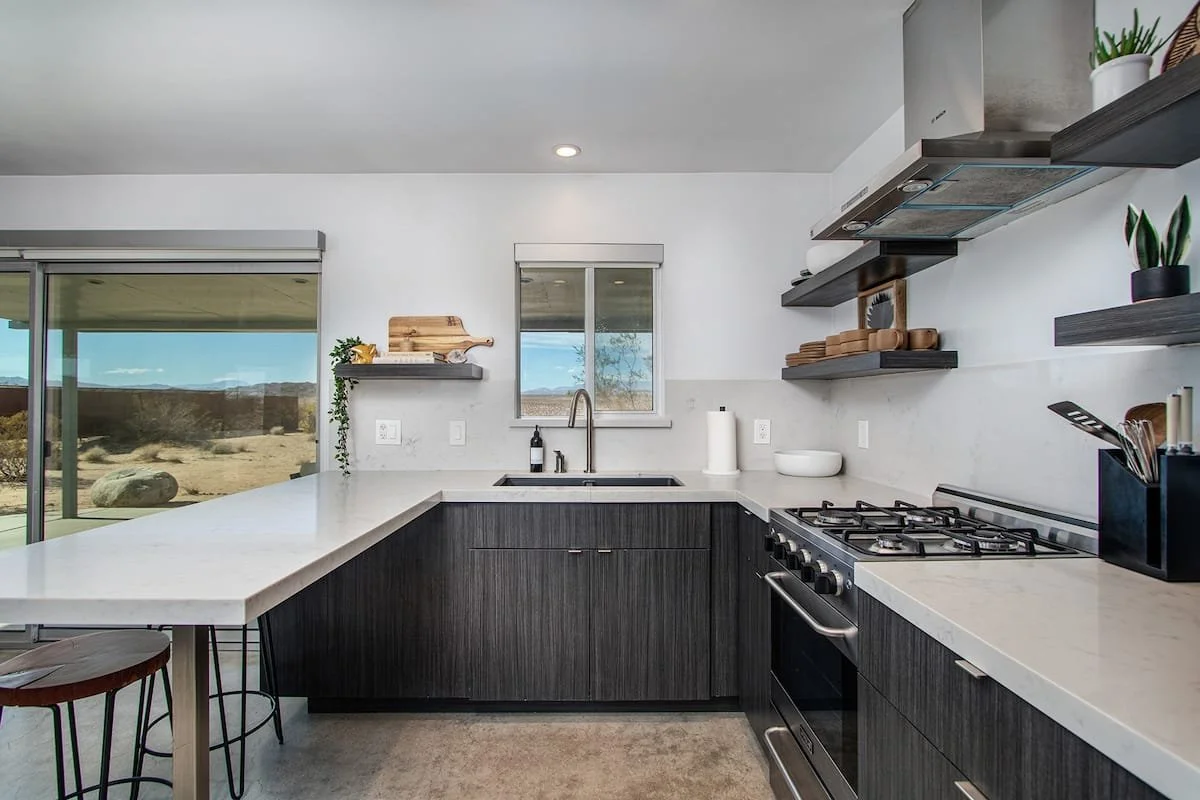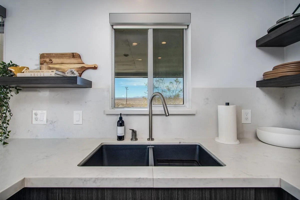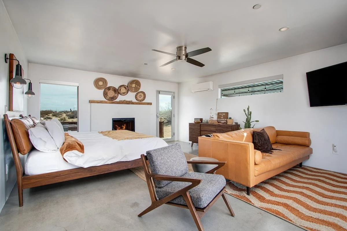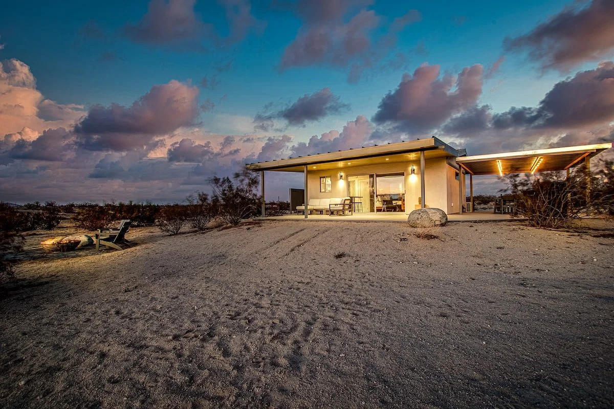 While the house is small on square footage, the property is expansive with many different outdoor possibilities--there's a covered side porch and outdoor dining table for enjoying meals cooked on the grill, an enclosed front patio area with POLYWOOD chairs for appreciating your morning roast from Joshua Tree Coffee Company (provided). The 10' sliders on the back of the house open up to reveal a covered porch and an outdoor sofa begging for a late afternoon nap. Throw on a house robe and turn on the path lights at night to wind your way over to the jacuzzi pad, where you can soak under the starry skies or lounge on the chairs while you count shooting stars. Enjoy a private outdoor shower with the most incredible sweeping desert views.