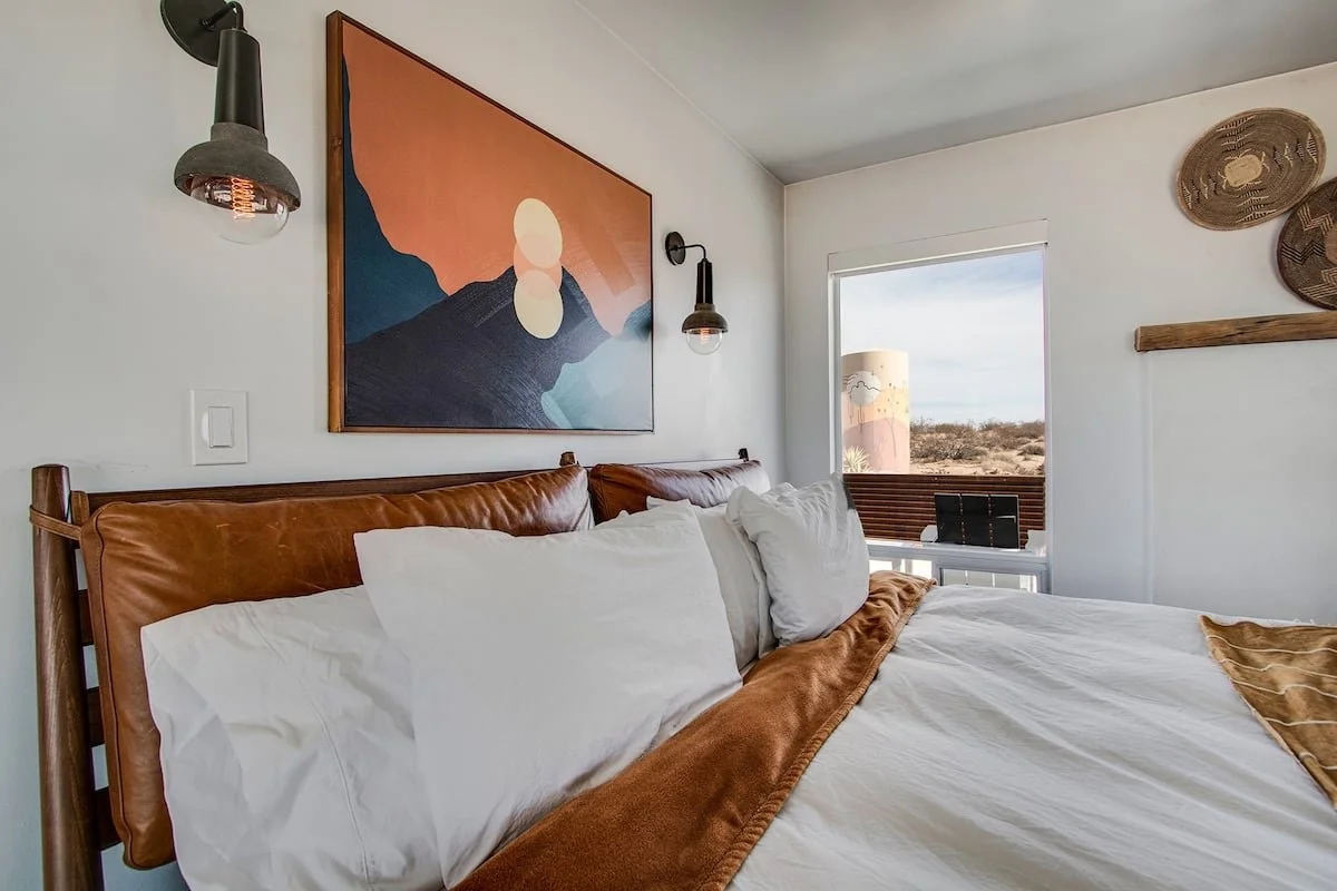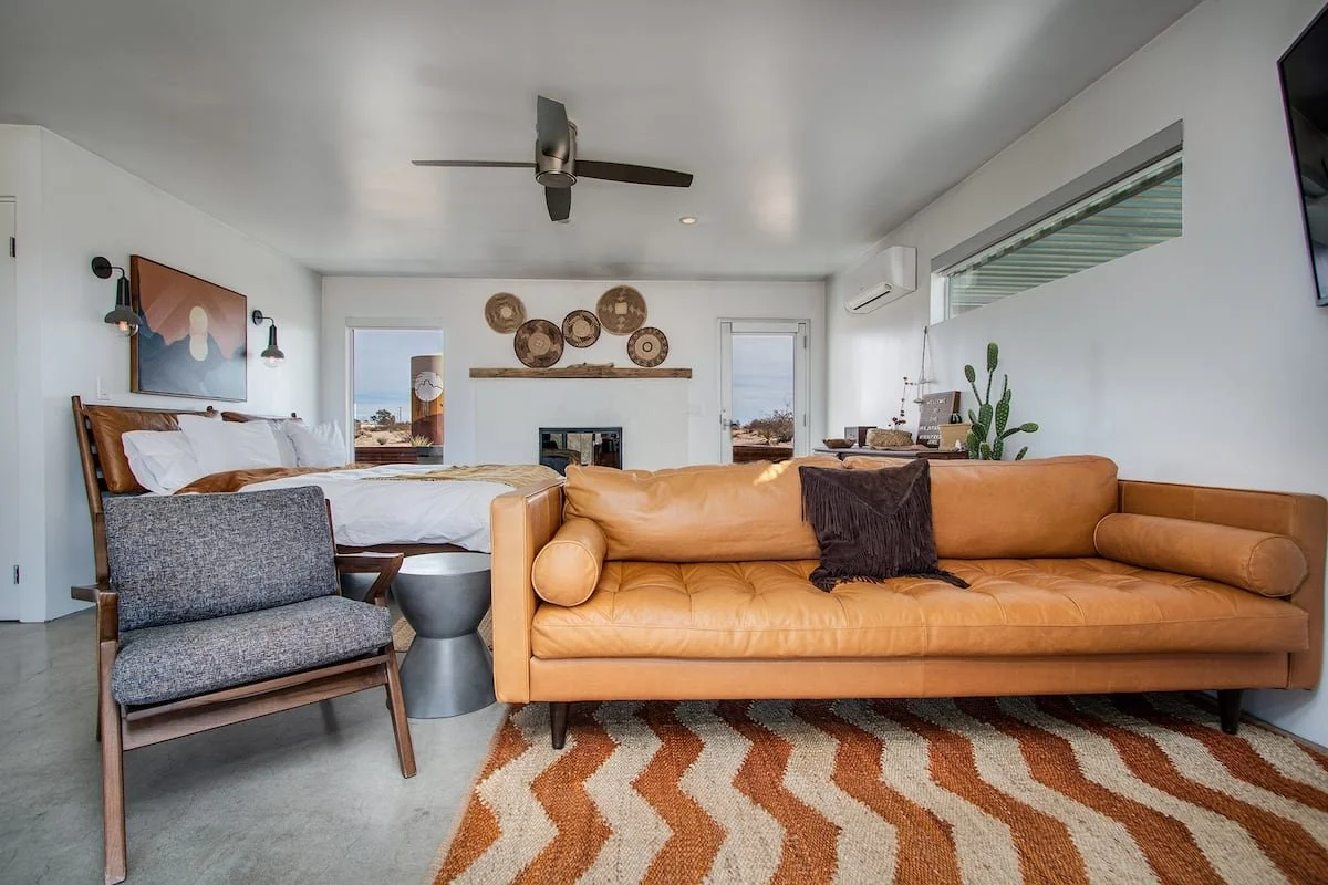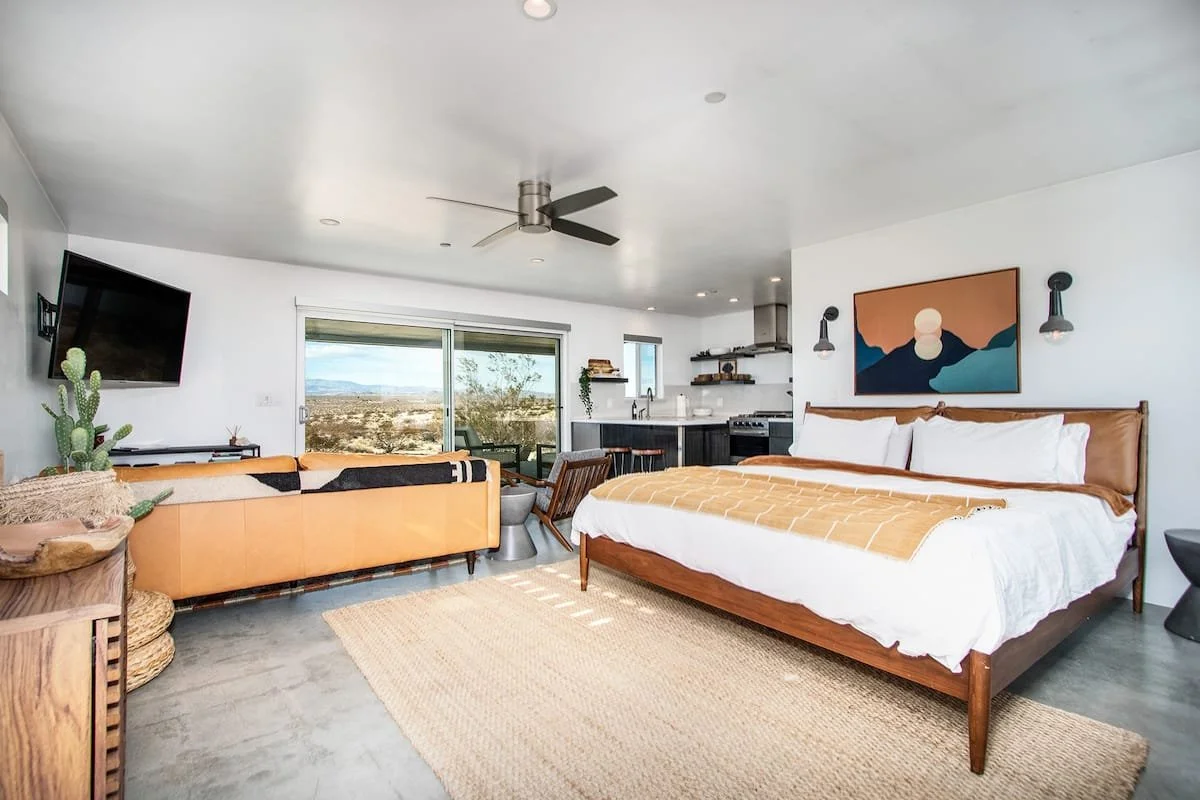 The Outside Inn is located on a stunning 2.5 acres of ridge-line just 15 minutes north of DT Joshua Tree, boasting sweeping views of Big Bear and the San Gorgonio. It is a recently re-designed 480 sq ft original Homesteader's Cabin, upgraded with a modern twist. While small on square footage, it's big on livability--soak up the sunrise from the front porch, enjoy the endless sunsets off the back porch, stargaze by the jacuzzi or fire pit, cool off in the outdoor shower. Bring the Outside In(n)!