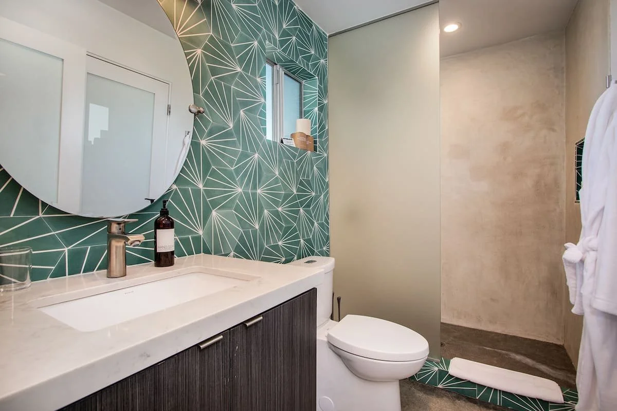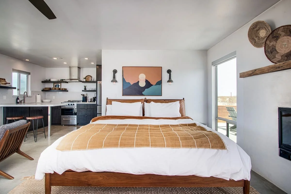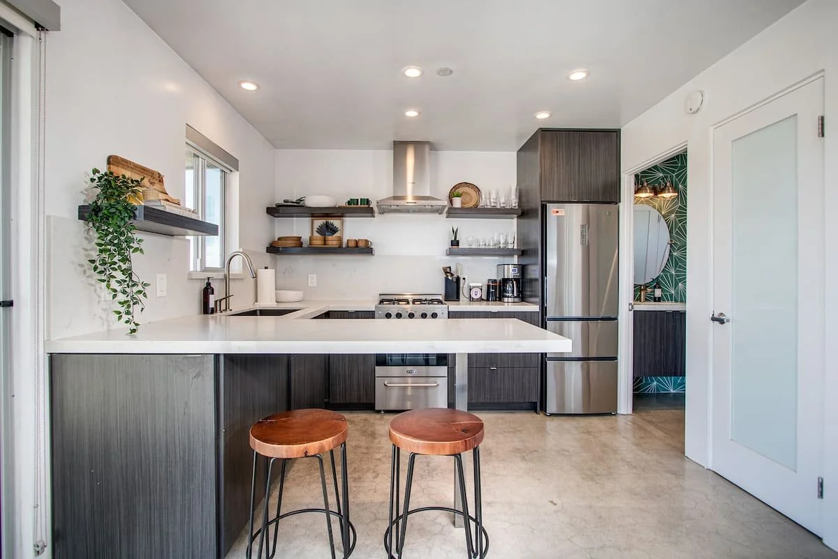 The fully redesigned bathroom is replete with a plaster and tiled accent wall, Seaweed Bath Co products, plush towels, and a closet for your storage needs. The designer kitchen is chef friendly, and stocked with everything one would need to enjoy cooking away from home. The television is on a swivel and can be moved to be watched from bed, on the couch or while cooking.